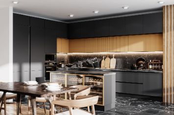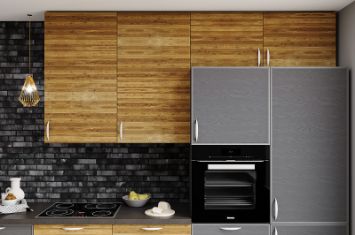 Модель фасадов Fabiana Wood комбинирует в своей форме элементы современного и неоклассического стилей. Расположенная по периметру лицевой стороны вогнутая филенка обладает мягким перепадом высоты и плавными стыками. Прилегая, друг к другу, соседние фасады создают мягкий рельеф, подчёркивая геометрию кухонного гарнитура и обеспечивая интересную игру светотени в общей композиции кухни.