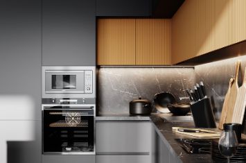 Гладкая четкость геометрии, элементы без излишеств, удобная интеграция бытовой техники и мойки создаст отличное настроение любому, кто будет готовить в этой кухне.