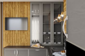 Фасады кухни изготовлены из ламинированного МДФ толщиной 22 мм. Это прочный и экологически безопасный материал, без неприятного запаха, который способен прослужить долгие годы, не утратив эстетичности и целостности.